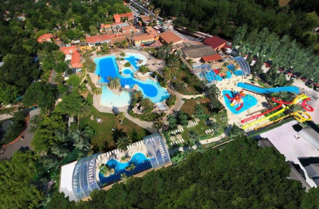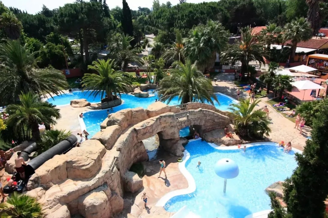 Er zijn meerdere zwembaden, lange glijbanen, een waterval, een overdekt gedeelte met speeltoestellen en er is een wellness centrum. De omgeving rond het zwembad ziet er prachtig uit. Er zijn rotsen en sierpalmen waardoor je echt het vakantiegevoel krijgt. Bij het zwembadcomplex is kunstgras gelegen. De ligweide is zo’n 1200m2 groot.